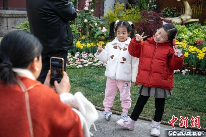 1月23日,两名儿童与花草合影。中新社记者 吴君毅 摄
