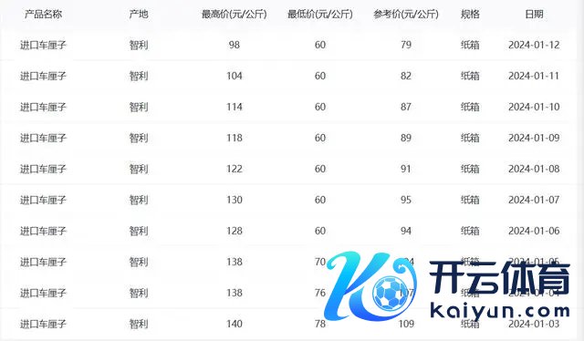 广州江南果菜市场发布的数据骄矜,2025年1月3日—1月12日,智利进口车厘子的不时下滑,参考价从1月3日的每公斤70元下滑到1月12日的每公斤55元,比较一个月前下滑过半。数据骄矜,客岁1月3日参考价钱为每公斤109元,客岁1月12日参考价钱为每公斤79元。