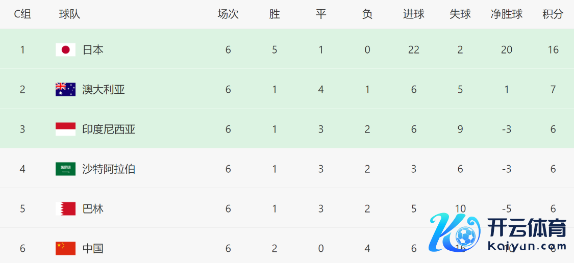 小组最新积分榜,日本6轮16分(第一)、澳大利亚6轮7分(第二)、印度尼西亚6轮6分(第三)、沙特6轮6分(第四)、巴林6轮6分(第五)、国足6轮6分(垫底)。