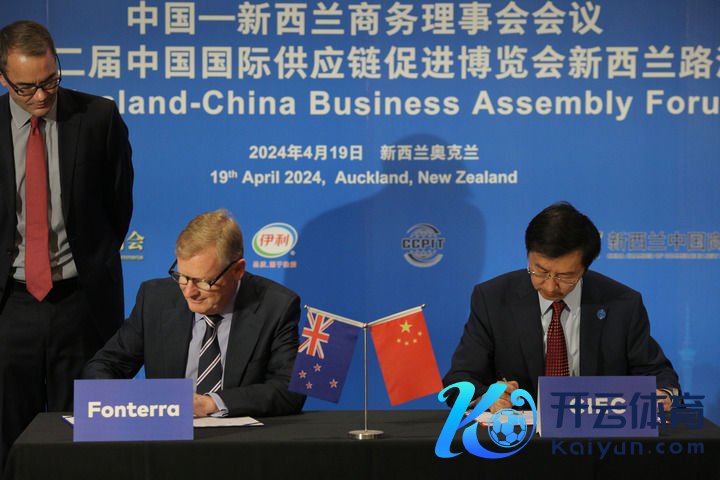 4月19日,在新西兰奥克兰举行的第五届中国-新西兰商务理事会会议暨第二届中国外洋供应链促进展览会路演行为上,中国外洋展览中心集团有限公司(中展集团)代表与新西兰恒自然集团代表签署参展意向书。新华社发(赵纲摄)