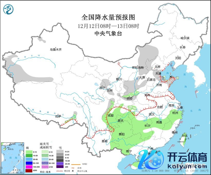12月12日08时至13日08时,新疆南疆盆地和西部山区、青海东部、甘肃南部、陕西中南部、山西、内蒙古中部、河北、北京西部、天津、山东半岛等地部分地区有小雪或雨夹雪,局地有中到大雪。西南地区东部、江南大部、华南北部和西部等地部分地区有小雨,局地有中雨。内蒙古西北部部分地区有5~6级风。