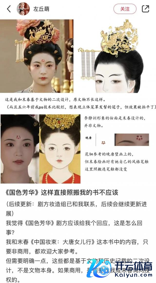 不外《国色青春》的妆造最近也堕入抄袭的争议,《中国妆束:大唐儿子行》一书的作家左丘萌生文称,《国色青春》中有变装的造型用到了其书中的内容,班师照搬的作念法不应该,若是商用需要找她或另一位作家末春参议授权。