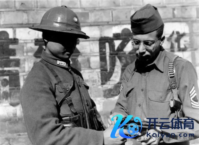 ▲检视中国士兵手中毛瑟 C96 手枪的好意思军附近军士埃利克 · 霍夫曼(Ellick Hoffman)。以笔者愚见,左边这名士兵头顶程序凉盔(盔中央为搪瓷材质的"苍天日间徽"),军衔为上等兵,应属其时的滇军部队