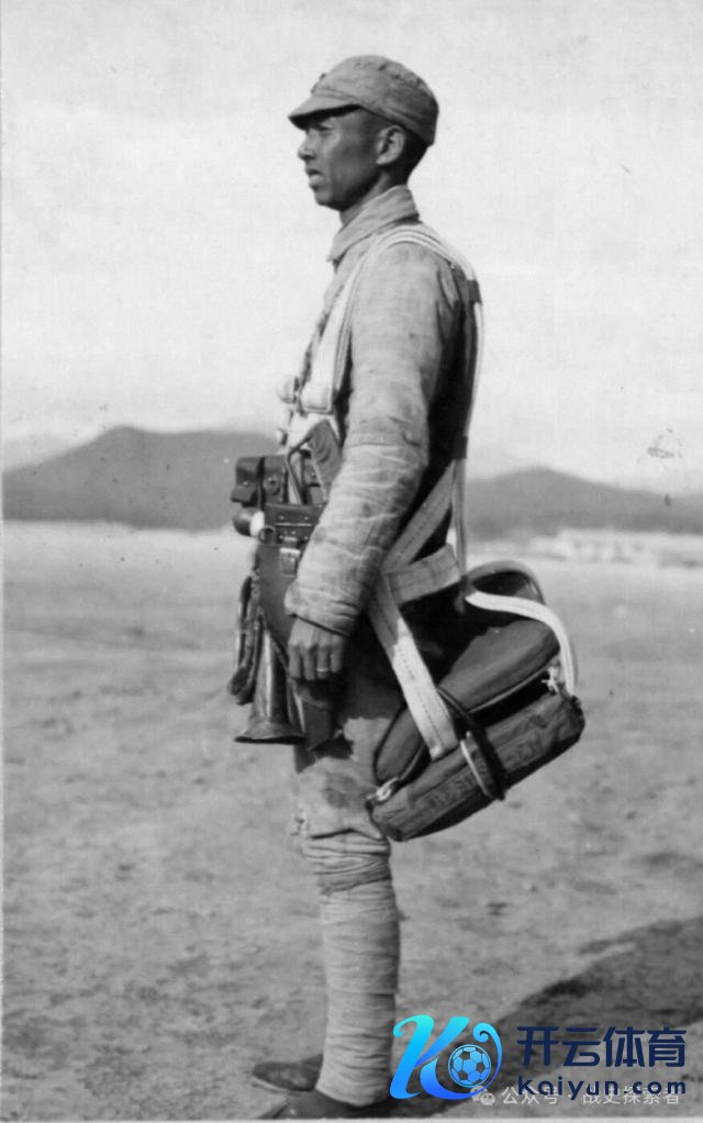▲一名身背伞包受训的中国士兵,摄于 1944 年。珍惜在其腰间还挎着一副门径的 C96 枪套