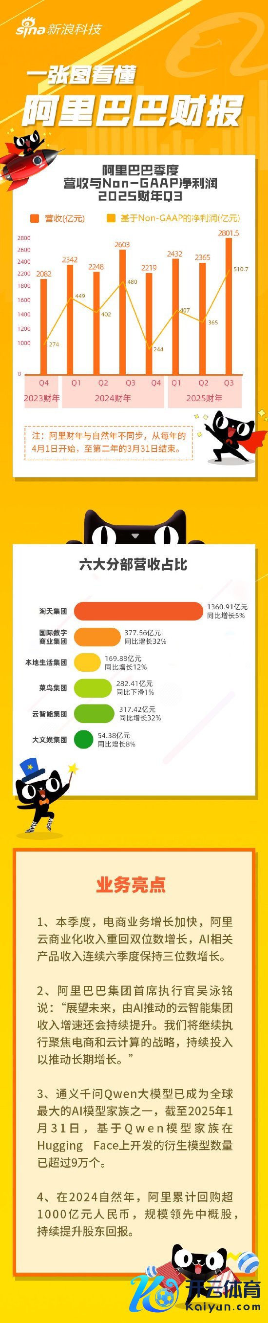 阿里巴巴发布2025财年第三财季财报:营收2801.54亿元(淘天1360.91亿+海外数字买卖377.56亿+云智能317.42亿+菜鸟282.41亿+土产货活命169.88亿+大娱乐54.38亿),同比增长8%;经调净利润510.66亿元,同比增长6%。2024当然年,阿里累计回购超1000亿元,范畴提高中概股。本季度,电买卖务增长加速,阿里云买卖化收入重回双位数增长,AI关系居品收入皆集六季度保捏三位数增长(注:阿里巴巴财年与当然年不同步,从每年的4月1日运行,至第二年的3月31日收尾)。