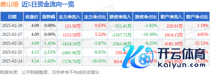 本站音信,领域2025年2月28日收盘,唐山港(601000)报收于4.09元,上升0.0%,换手率0.8%,成交量47.29万手,成交额1.94亿元。