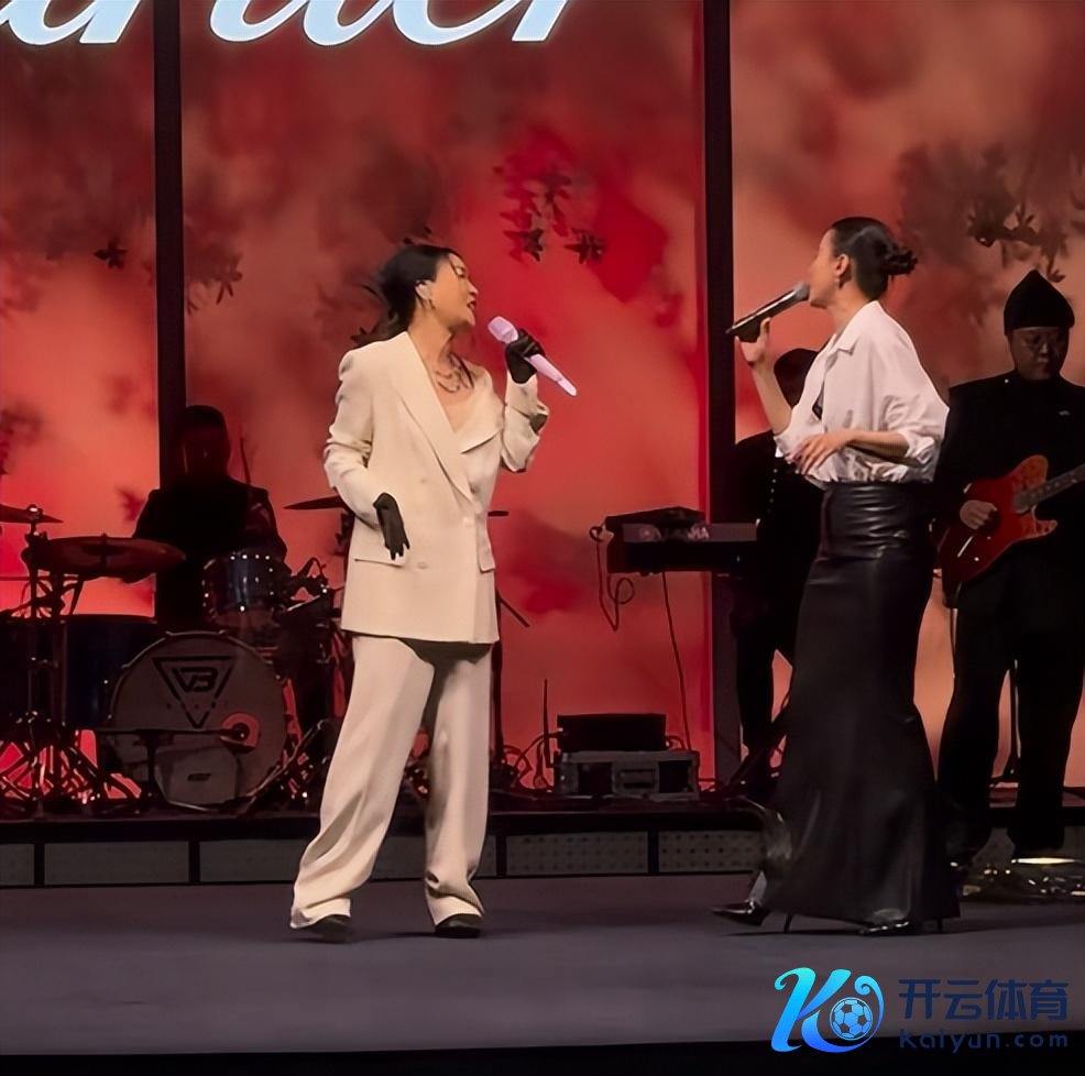 她一稔白色西装套装,一连唱了5首经典歌曲,把现场形成了大型KTV。