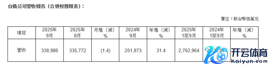 台积电:9月吞并营收3309.8亿元新台币 同比增多31.4%台积电:9月吞并营收3309.8亿元新台币 同比增多31.4%
