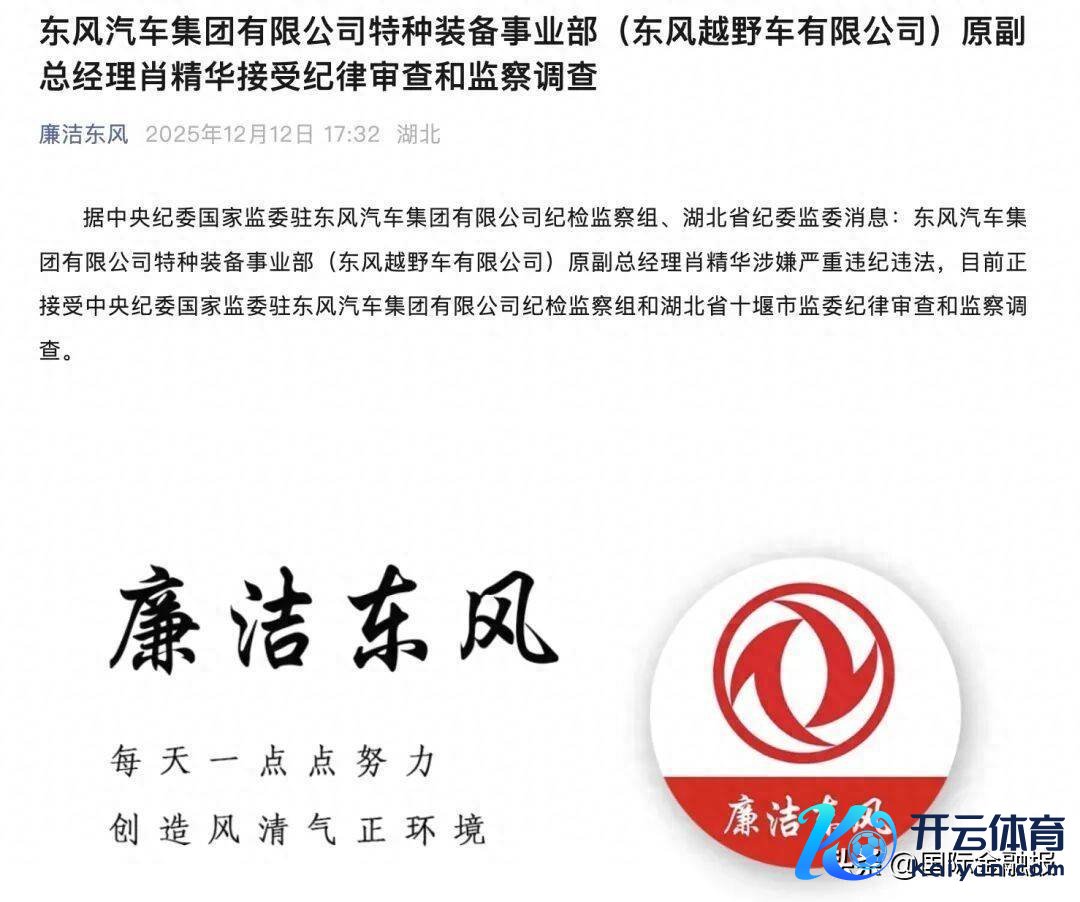 近日开yun体育网,凭据中央纪委国度监委驻东风汽车集团有限公司纪检监察组、湖北省纪委监委音书,东风汽车集团有限公司特种装备事迹部(东风越野车有限公司)原副总司理肖精华涉嫌严重非法坐法,正接收次第审查和监察看望。